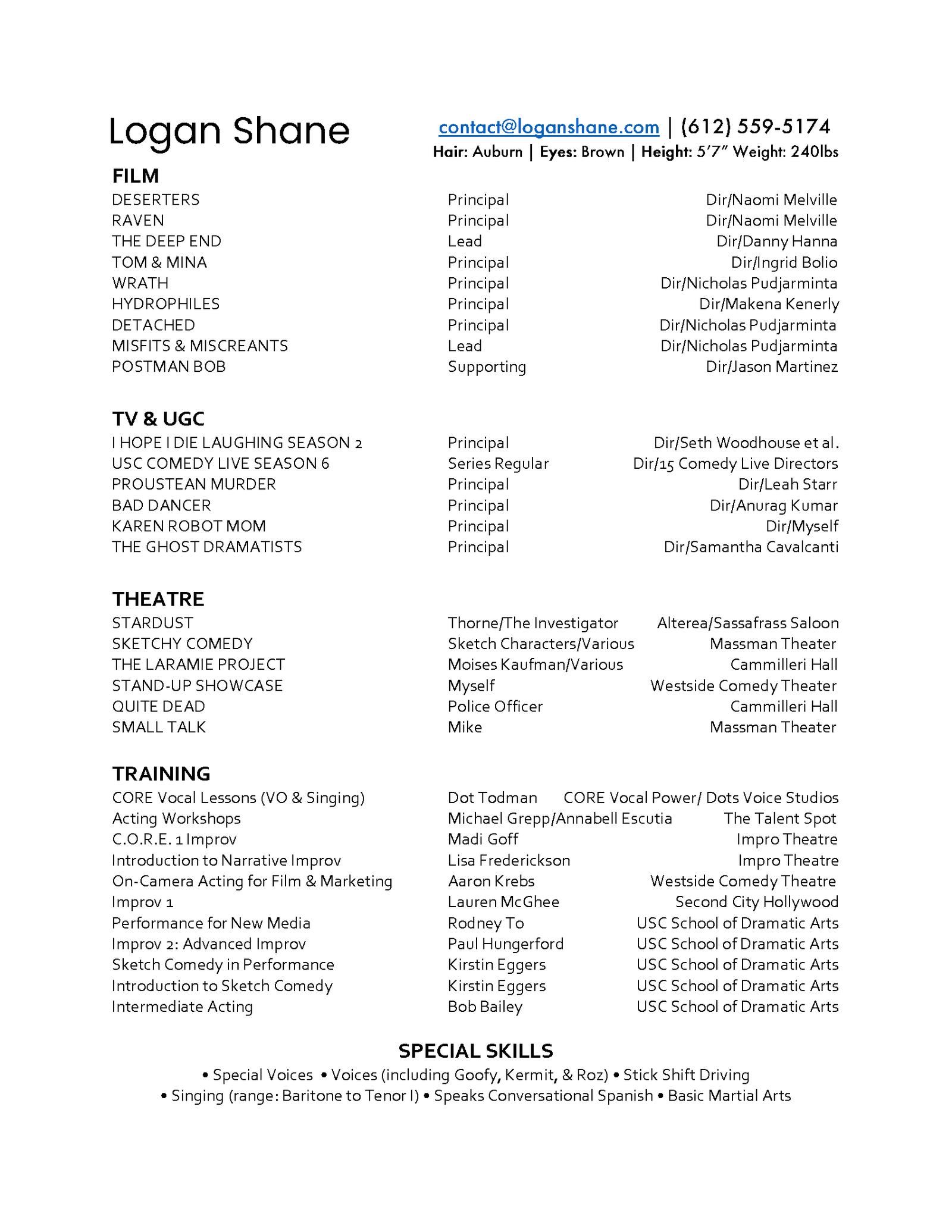 Originally admitted into USC’s School of Dramatic Arts for Acting (BA), Logan also holds a master’s degree in Digital Social Media (MS) and has trained under industry veterans in comedy, improv, voice, and movement. When not performing, he produces original short films and studies the intersection of storytelling and technology.